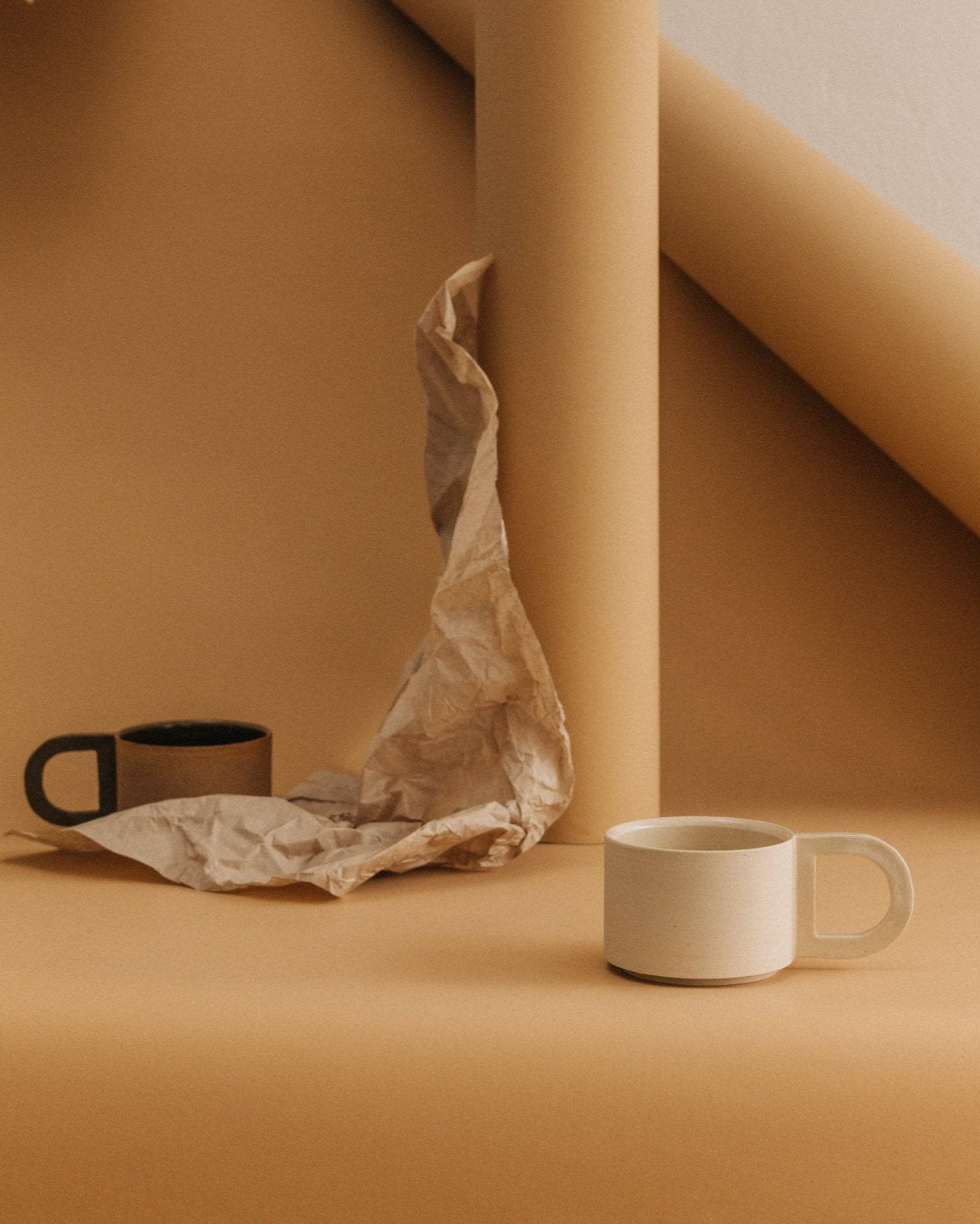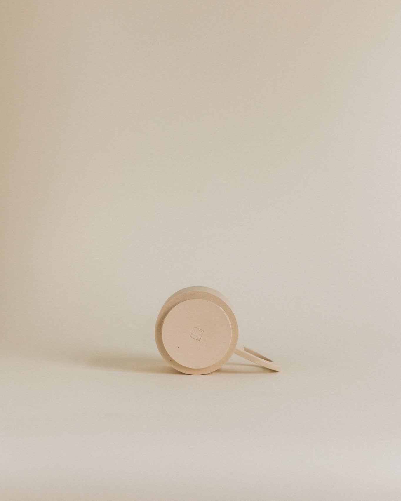 Diese Tasse wird aus hell-beigen Steinzeugton an der Drehscheibe handgefertigt und mit einem Henkel versehen. Innen und am Henkel ist sie glänzend glasiert, während die Außenseite unglasiert bleibt.
