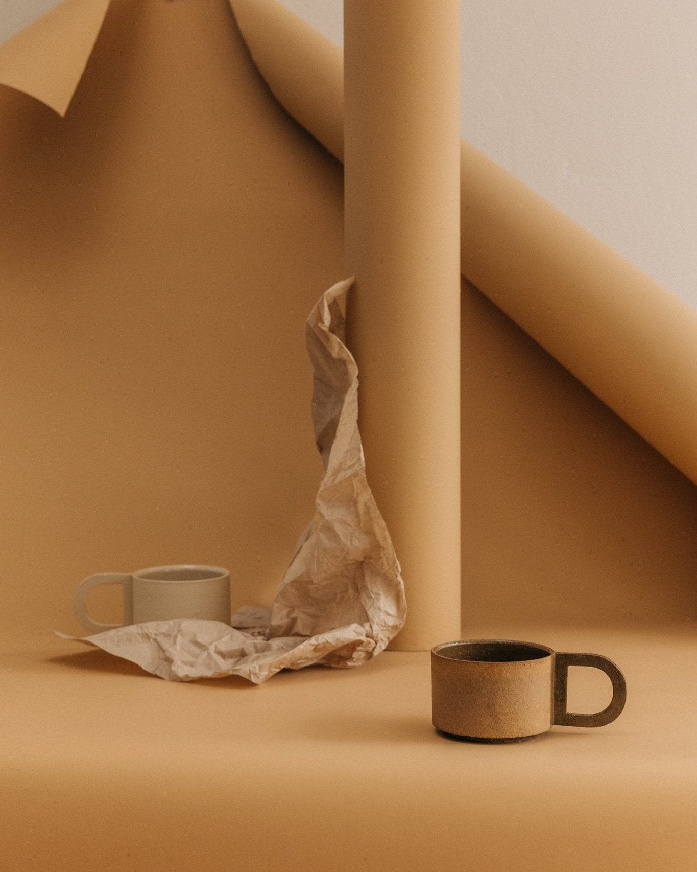 Diese Tasse wird aus braunen Steinzeugton an der Drehscheibe handgefertigt und mit einem Henkel versehen. Innen und am Henkel ist sie glänzend glasiert, während die Außenseite unglasiert bleibt.